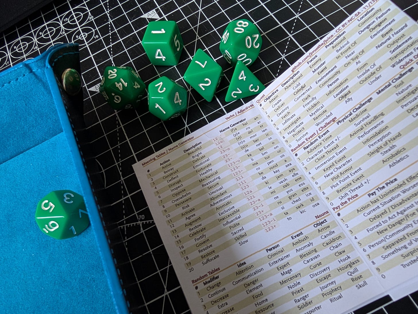 I've been using Juice Oracle for a while to add depth to my games, but I’ve never used it exclusively. I appreciate its small, portable form factor - it's easy to have on hand whenever inspiration strikes! The Juice Oracle is designed to provide prompts and inspiration for creating characters, quests, and world elements through dice rolls and interpretation. Each session will detail my process of using the Oracle, the results of the dice rolls, and how I weave those elements into a compelling story for newcomers to solo TTRPGs and the Oracle alike.